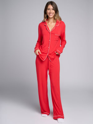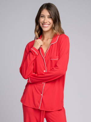 The Luna PJ Top features a classic notched collar, button-front closure, and contrast piping for that timeless, tailored look. The Luna PJ Pants are relaxed with an elastic waistband and adjustable drawstring — designed for effortless comfort from bedtime to slow mornings together.