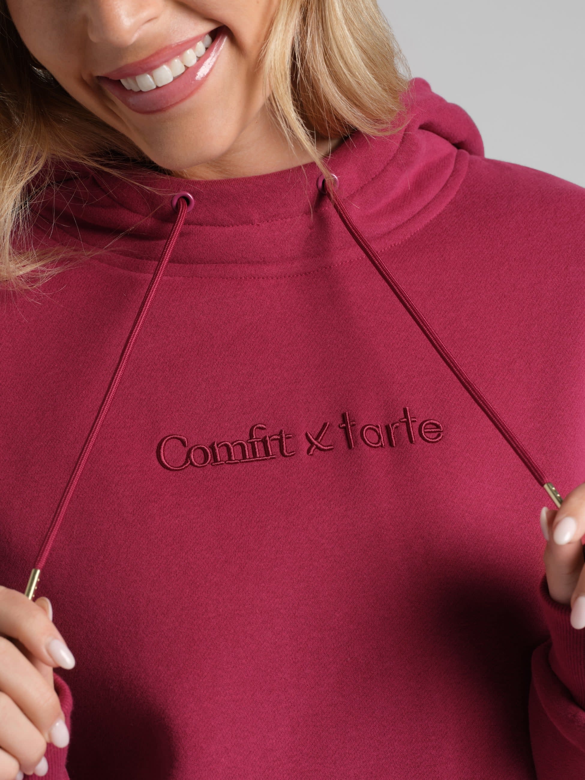 When you need to shut the world out, the oversized double-lined hood doubles as a built-in contoured eye mask — rest included. Finished with a Comfrt x tarte embroidered logo and gold-tipped drawcords for an elevated touch.