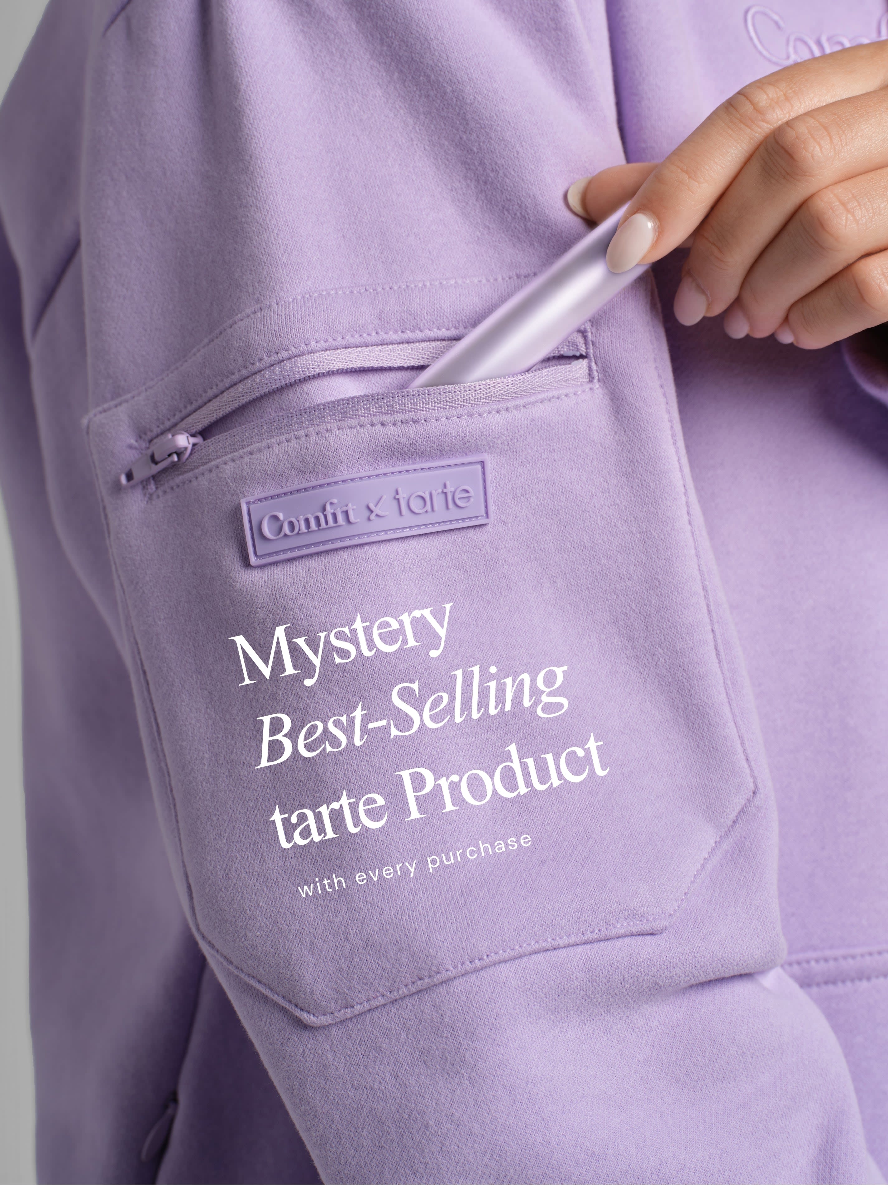 Each hoodie comes with a tarte gift with purchase tucked in the sleeve pocket. The full experience, all in one.