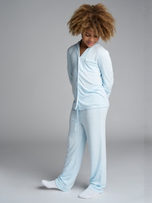 The top features a classic collar, easy button-front, and chest pocket with contrast piping for a polished touch. Matching pants have a relaxed fit and comfy elastic waistband so they can move, stretch, and play with ease.