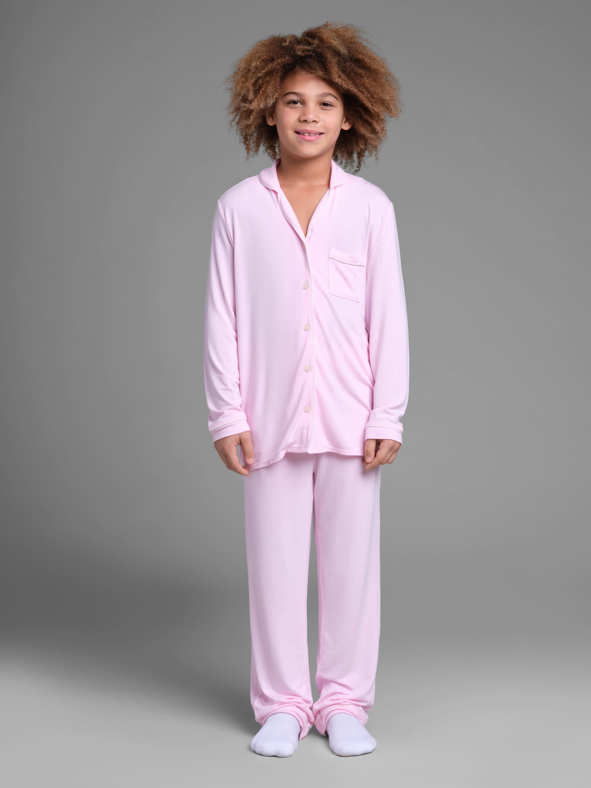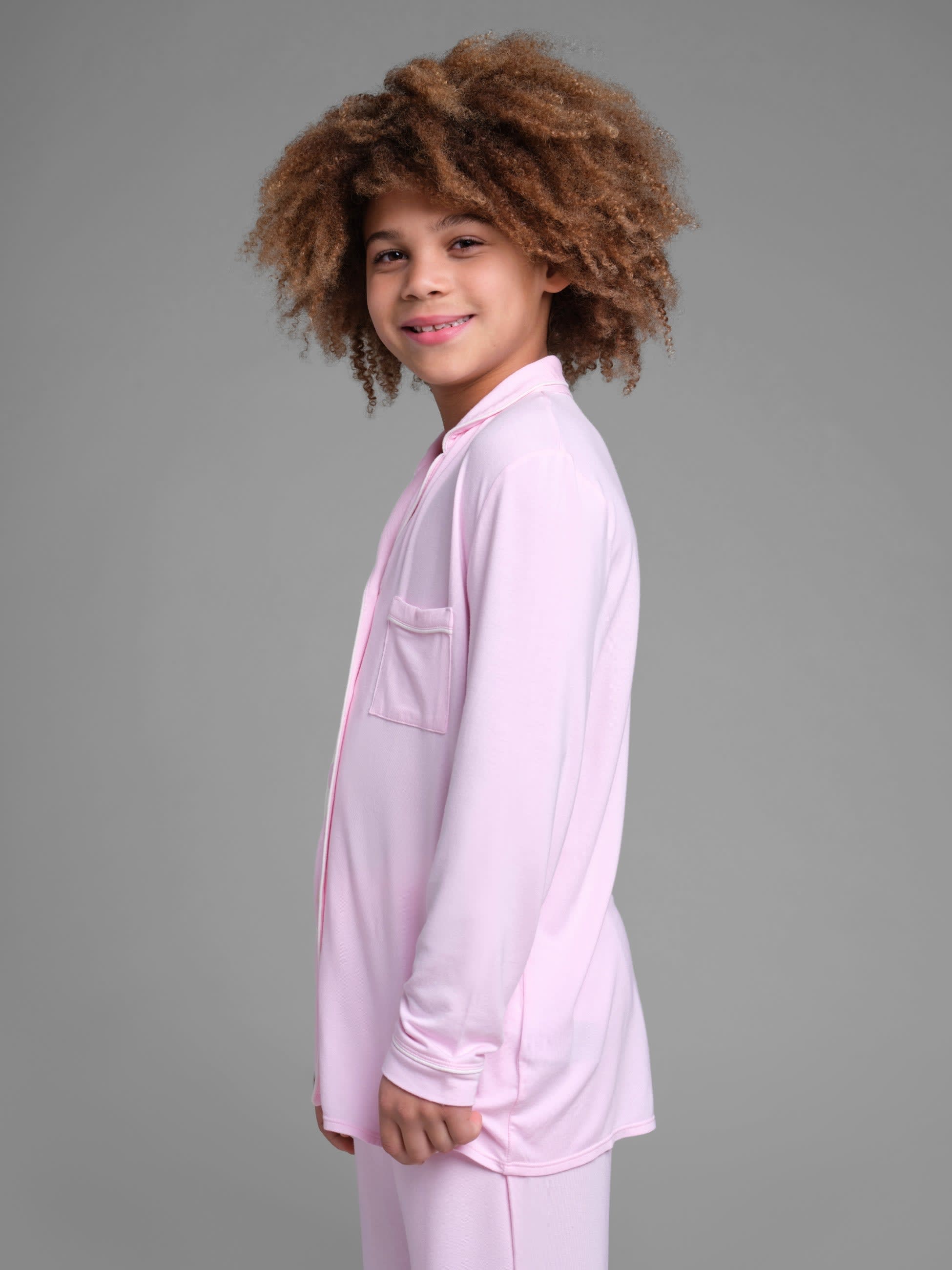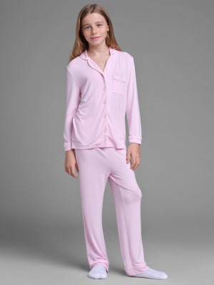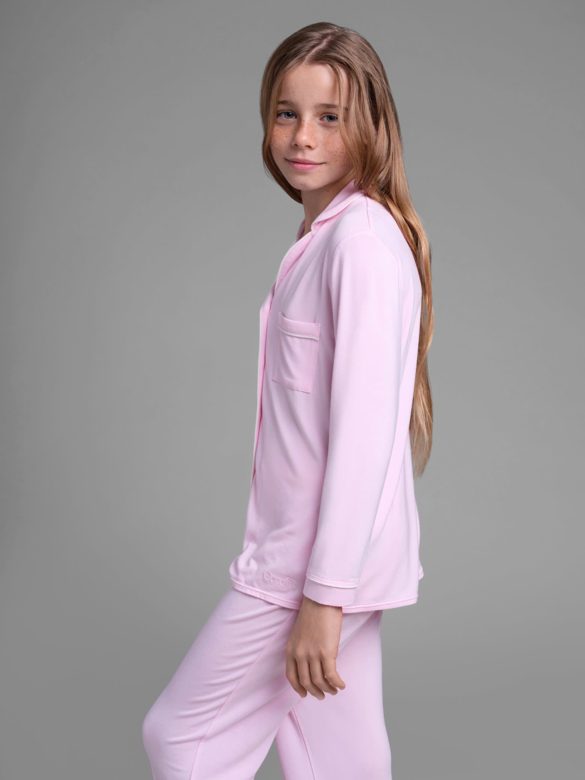 The top features a classic collar, easy button-front, and chest pocket with contrast piping for a polished touch. Matching pants have a relaxed fit and comfy elastic waistband so they can move, stretch, and play with ease.