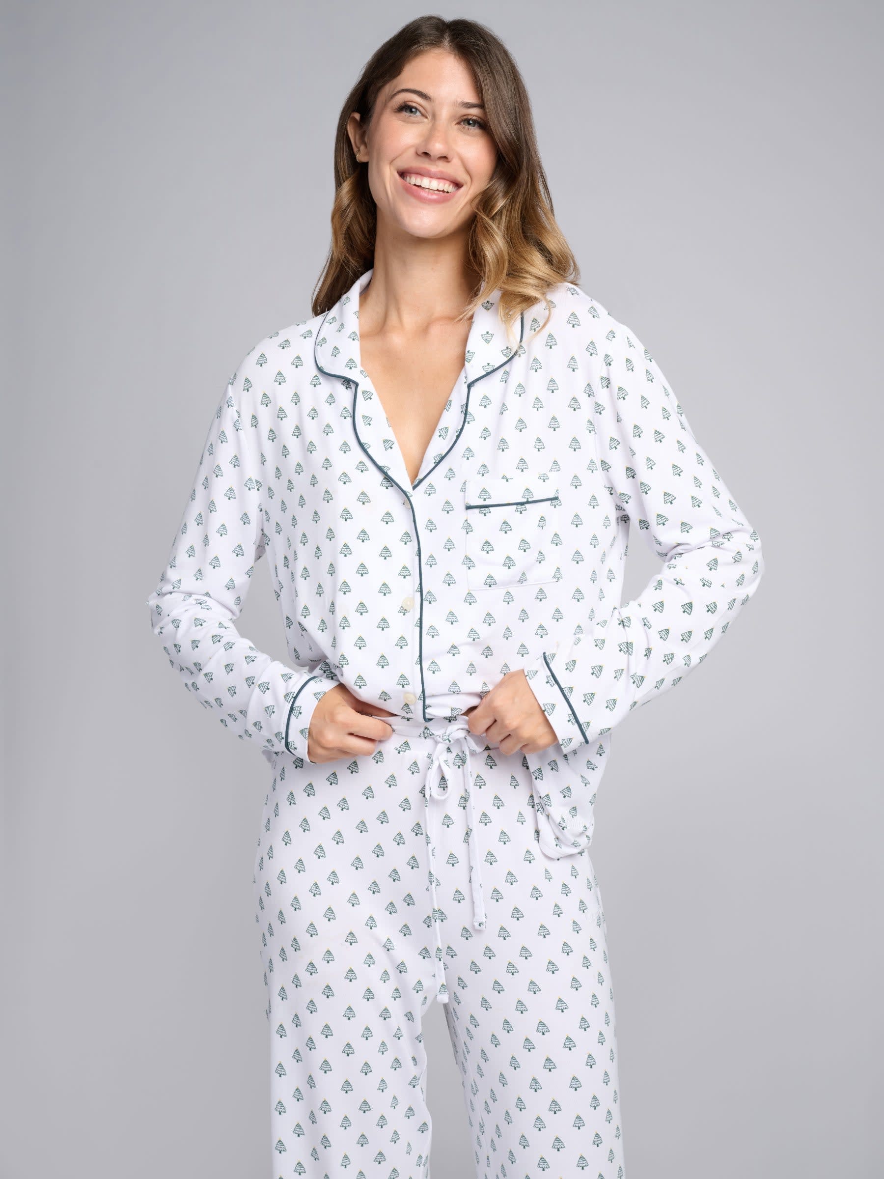 The top features a classic notched collar, button-front closure, and patch pocket, all finished with contrast piping for an elevated look. Matching pants are relaxed with an elastic waistband and coordinating piping details for effortless polish.