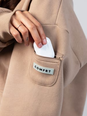 First hoodie from Comfrt. I got a size XL and its perfect. I’m huge on pockets and this exceeded my expectations!!! True to size and still feels slightly oversized. I am 5’8, 205lbs, and a size DDD/G cup. Leaves enough room for my chest. Buttery soft material. Keeps me warm, cant wait to wear this for the fall days. Will definitely be buying more sets.