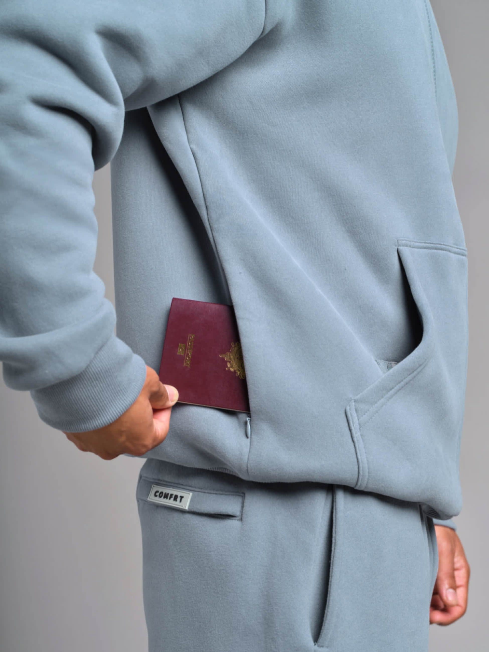Designed for ultimate versatility, this classic zip-up combines the ease of a full-zip closure with the functionality of our best-selling Travel Essentials Hoodie. Think of it as the perfect evolution—everything you love, now with a zipper. Crafted for comfort and convenience, it features 5 secure zipper pockets to keep your essentials—passport, phone, earbuds—safe and accessible. The slightly weighted fabric provides a calming, grounded feel, while the oversized yet structured fit gives you the perfect balance of roominess and a refined silhouette. It’s more tailored than the Cloud Zip Hoodie but just as effortless.