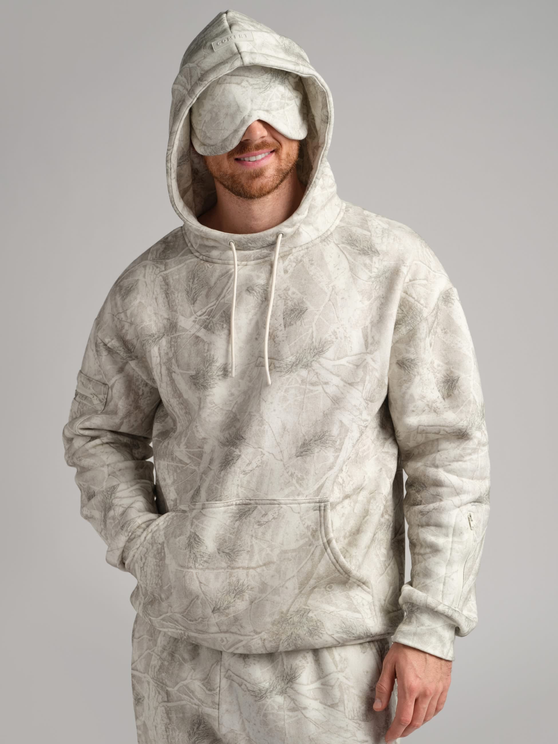 Wrap yourself in Comfrt and unplug with Airplane Mode. Made from our ultra-soft Combed Cotton Blend™, this hoodie is built for long flights and even longer naps. A built-in contoured eyemask lets you snooze in peace, while zip sleeve pockets keep your AirPods close. Hidden compartments inside the kangaroo pocket store your passport, ID, and cash securely. Finished with an oversized, double-lined hood for total comfort—no matter where you land.