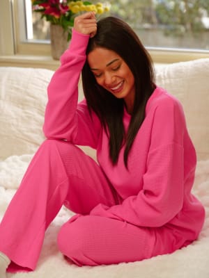 Get cozy with our mid-rise waffle knit sweatpants. They have a relaxed fit and a wide leg. They’re made with a super soft knit texture.