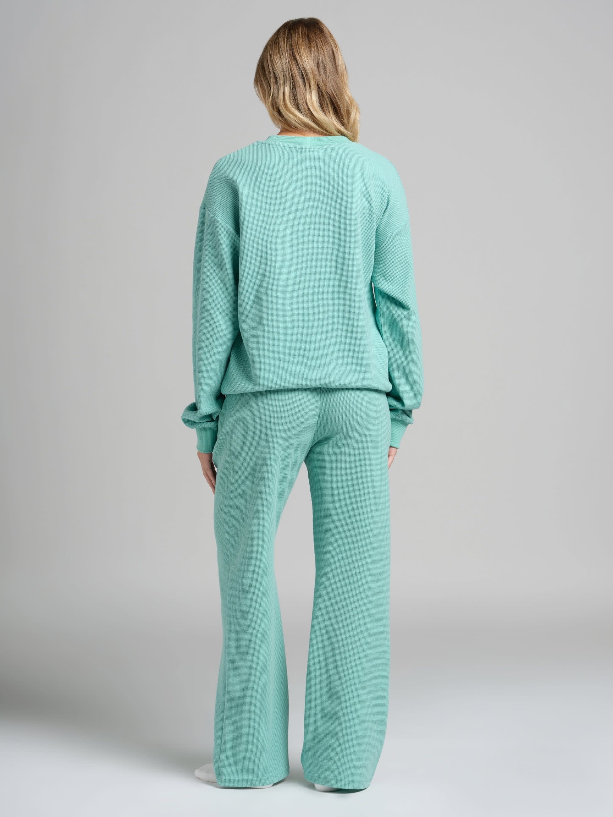 Get cozy with our mid-rise waffle knit sweatpants. They have a relaxed fit and a wide leg. They’re made with a super soft knit texture.
